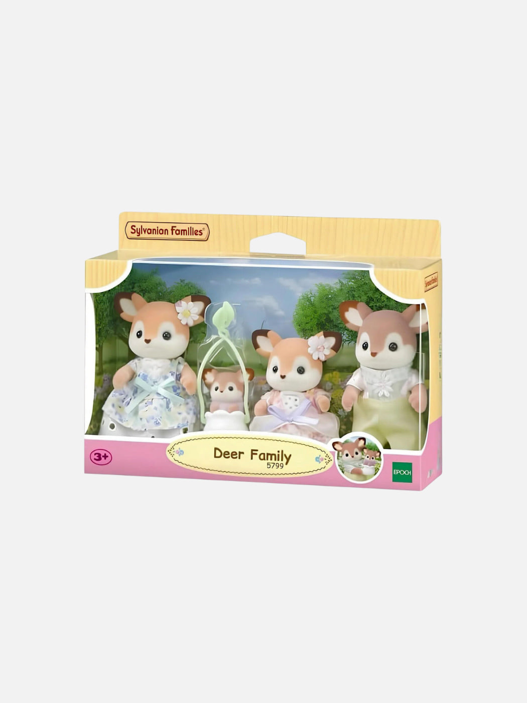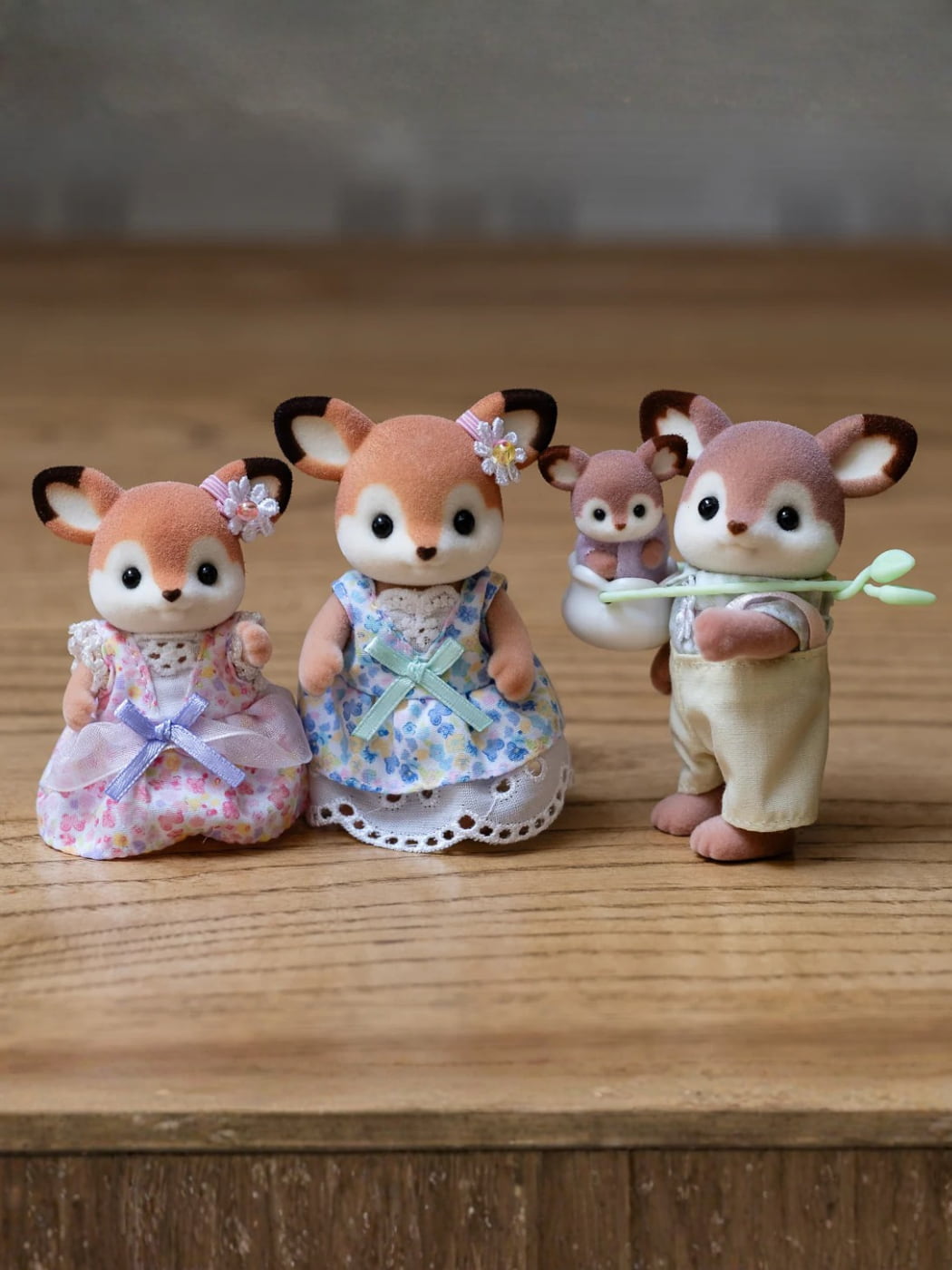 Meet the Deer Family - This adorable Sylvanian Families set includes Father Marius, Mother Primrose, Sister Sofia, and Baby Aster in a sweet little baby carrier. Dressed in removable fabric clothing, these miniature animals have articulated arms, legs and head made from soft velveteen. Their little heart shaped noses and flowers on the ears, make the deer family even cuter.