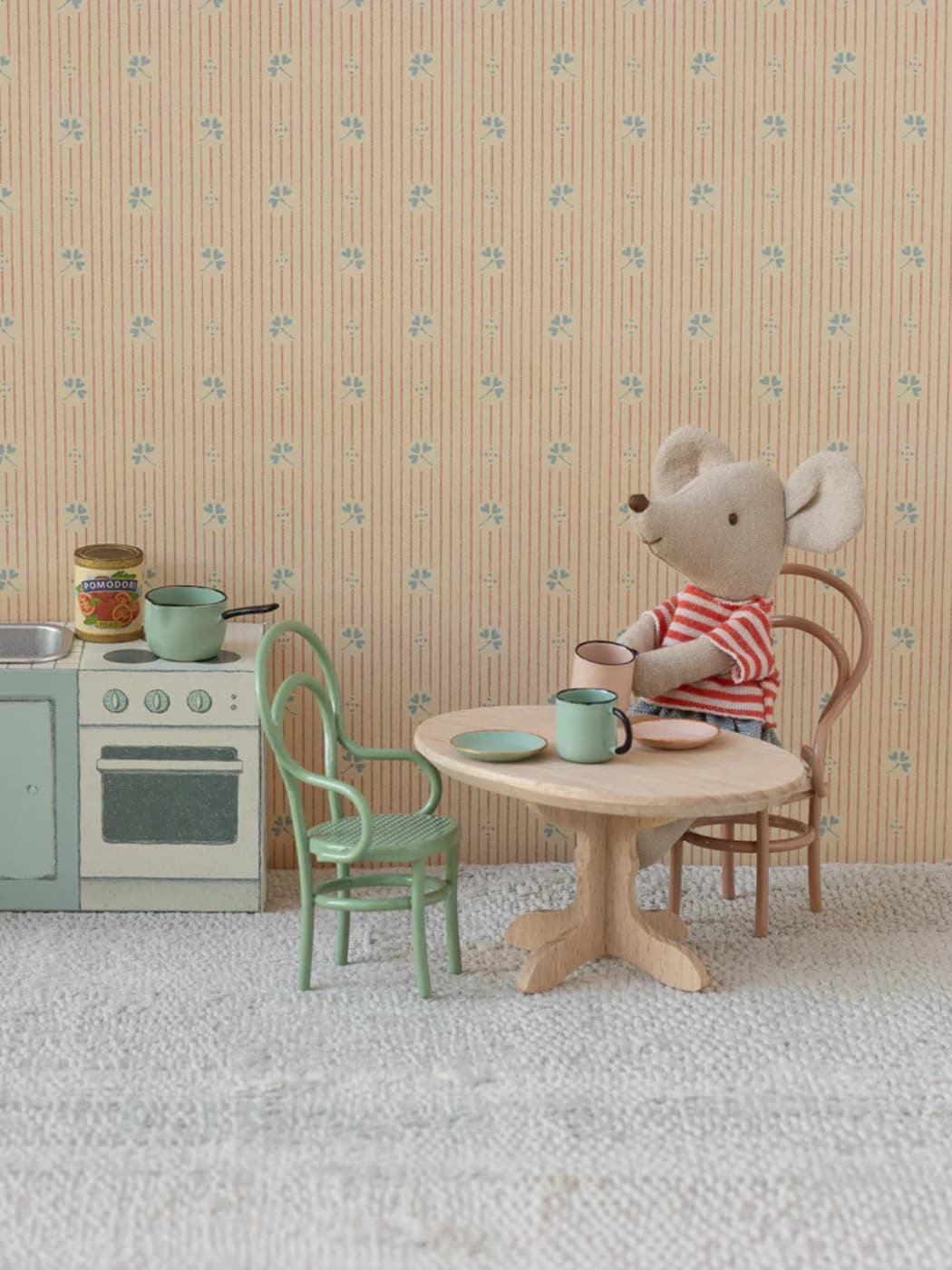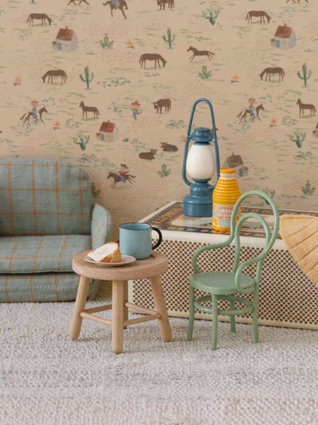 A vintage looking chair by Maileg that fits the mouse family. Made from mint coloured powder coated metal just like the real thing. These chairs can be used in the kitchen, dining room, patio, office for mice or other little toys in the doll house.